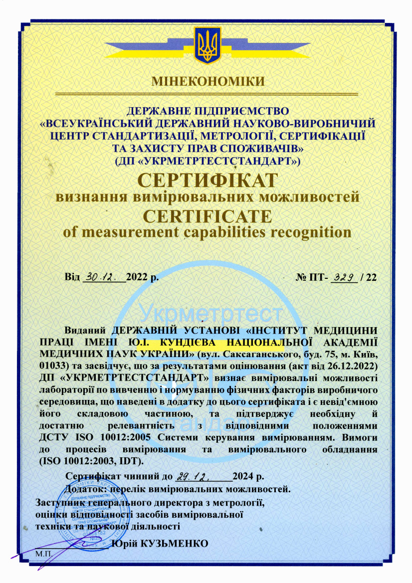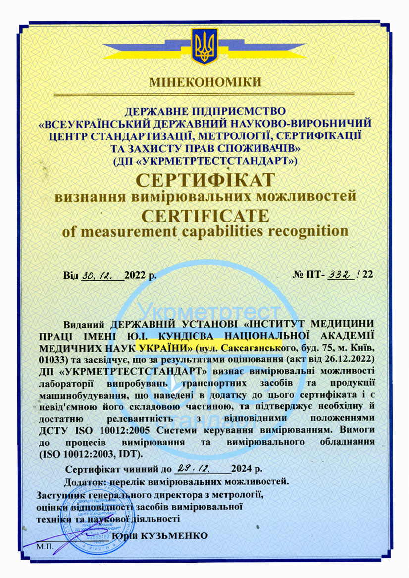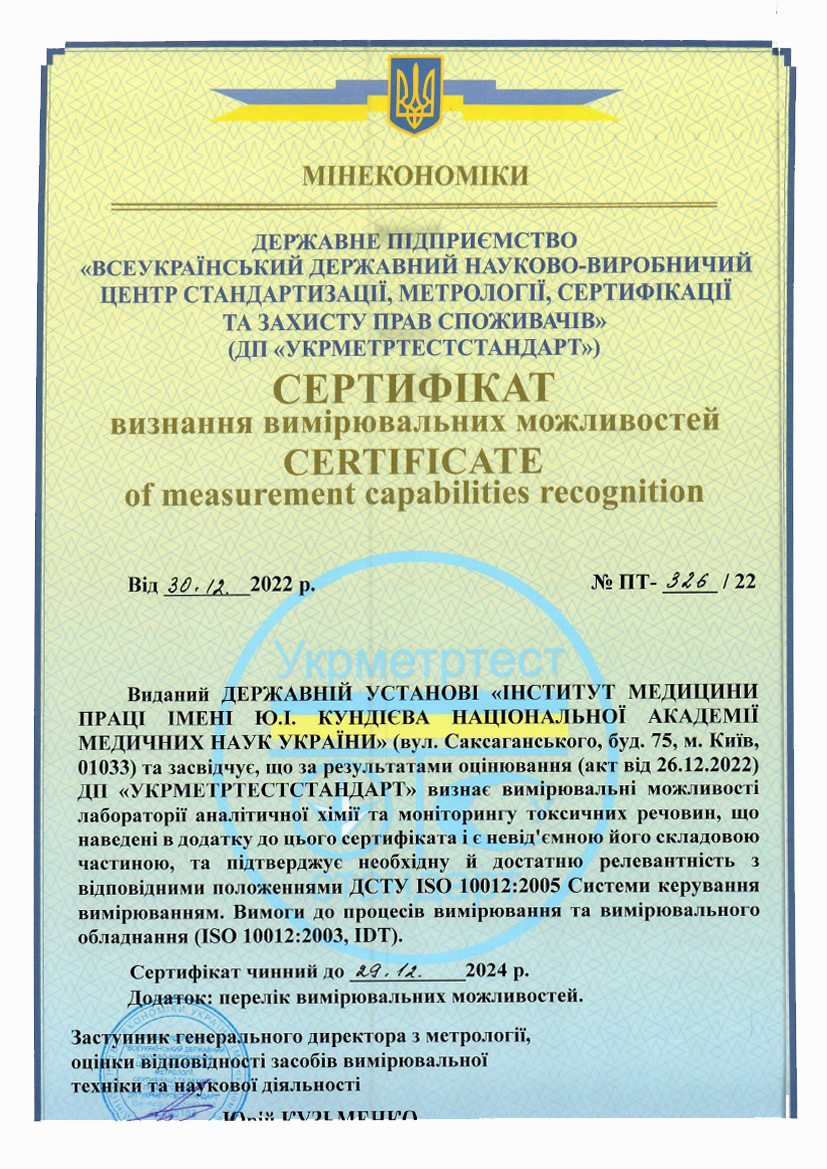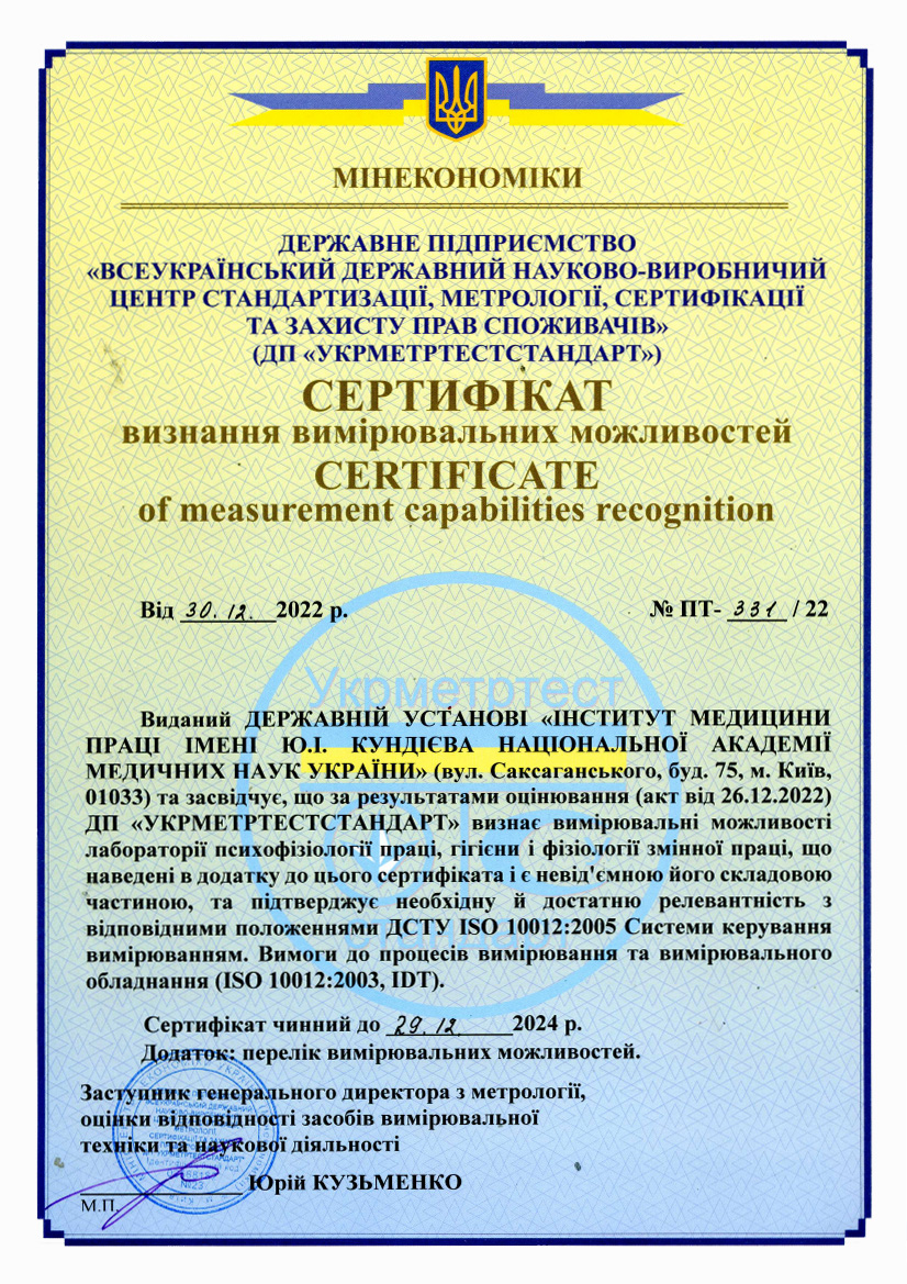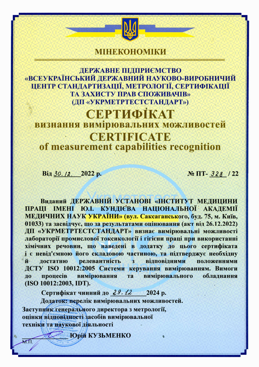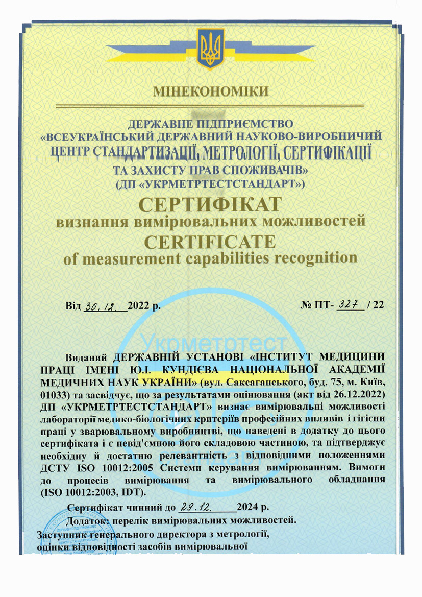 Recognizes the measuring capabilities of the laboratory of medical and biological criteria of occupational exposures and occupational hygiene in welding production
