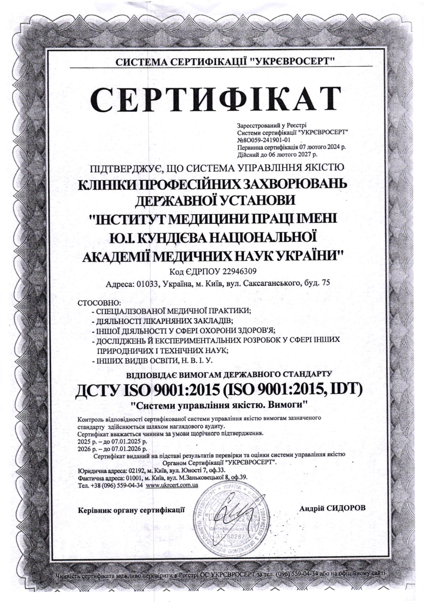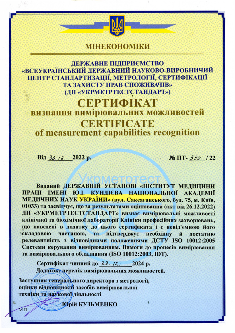 Recognizes the measuring capabilities of the clinical and biochemical laboratory of the Clinic of Occupational Disease